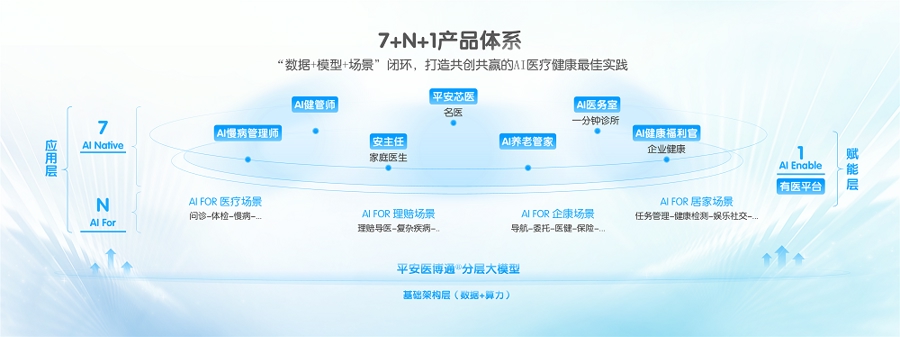 会上,平安好医生首次推出全场景、全周期、全生态的“7+N+1”AI医疗产品矩阵:N为“人+机”的既往AI Agent智能体赋能产品的升级,7则是本次首发的“机+人”全原生进化AI医疗产品,包括“平安芯医”“安主任”、AI养老管家、AI医务室、AI健管师、AI慢病管理师、AI健康福利官等;1指行业赋能的“有医”平台,让平安好医生的AI医疗底层核心能力惠及整个社会。